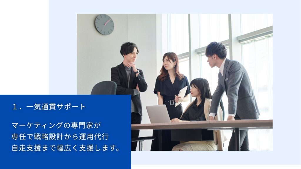 “現場の課題感や目標に合わせて”マーケティングの専門知識を持つプロが、設計から運用代行、自走支援まで専任でサポートするサービスです。